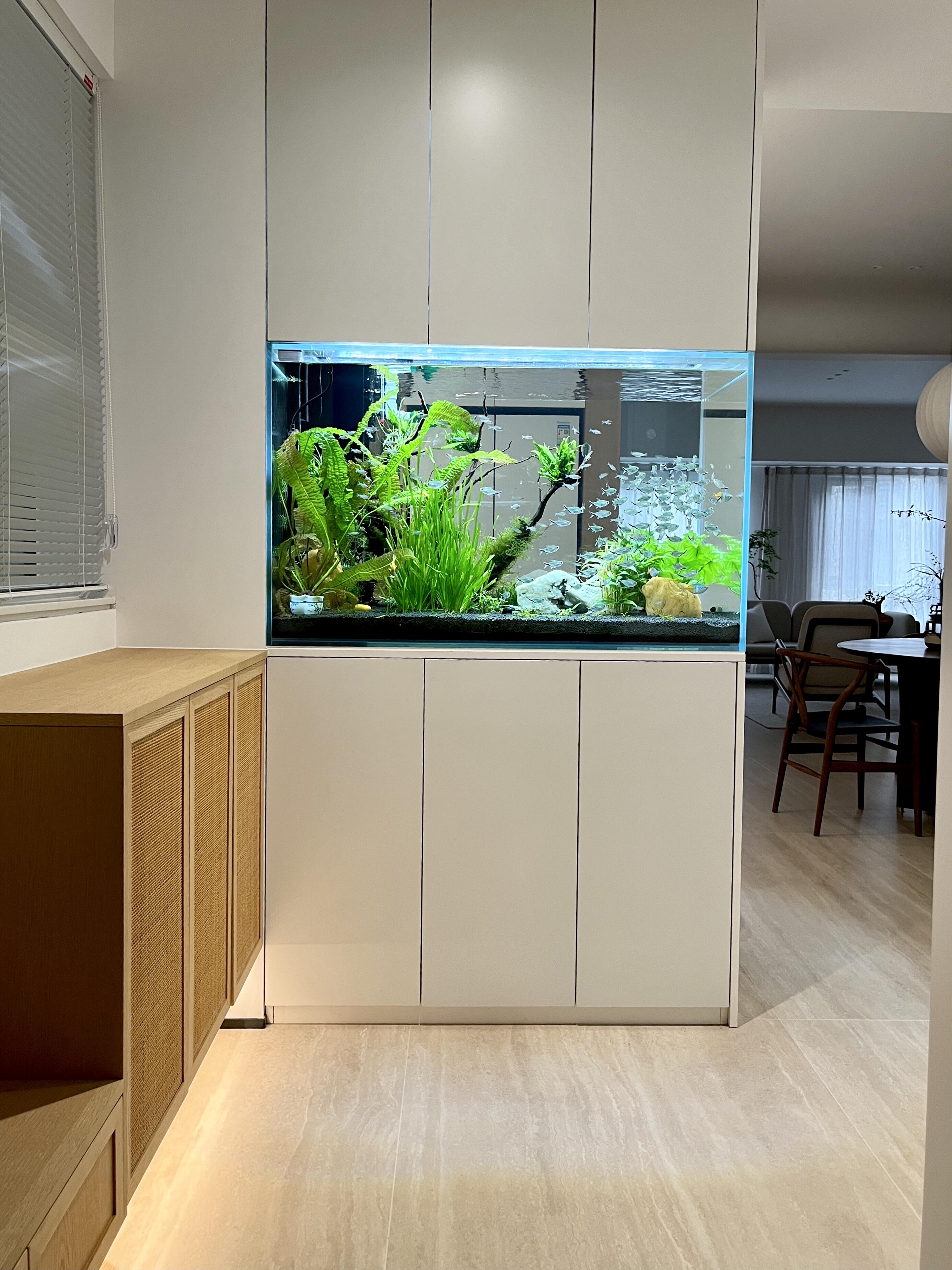 在設(shè)計上,它高效利用墻體或柜體空間,解決傳統(tǒng)魚缸占獨立空間的問題。且嵌入式結(jié)構(gòu)使其成為視覺焦點,水中游魚與造景呼應(yīng),為空間注入自然生機,無論是客廳作為藝術(shù)點綴,還是廚房增添生活意趣,都能打破水族與空間的邊界,讓水族藝術(shù)深度融入空間肌理,為居住者打造獨特且富有生機的居住體驗。
