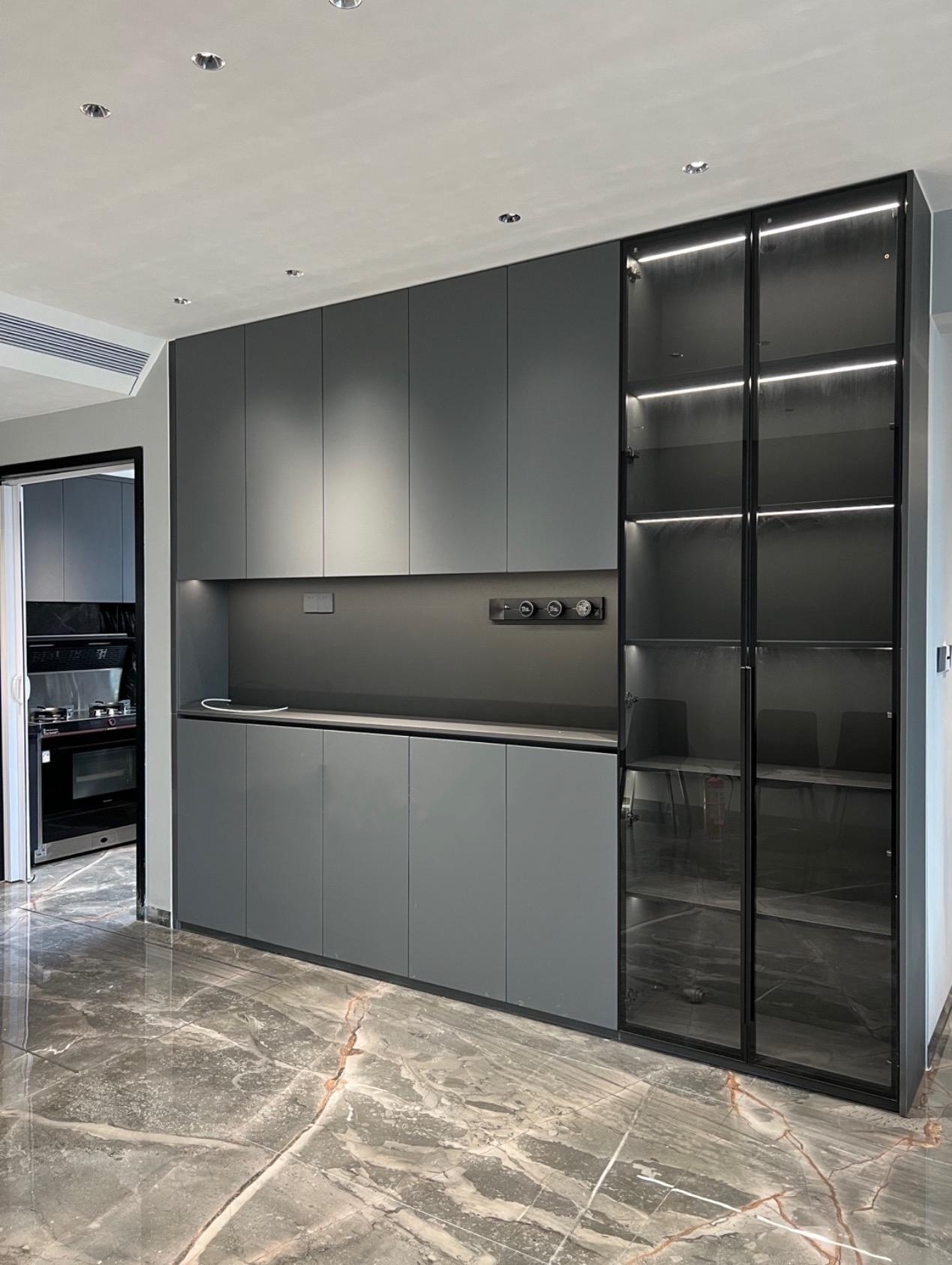 冷灰極簡風(fēng)款嵌入墻面,預(yù)留電器位,咖啡機(jī)、烤箱穩(wěn)穩(wěn)安放,適配現(xiàn)代簡約廚房。